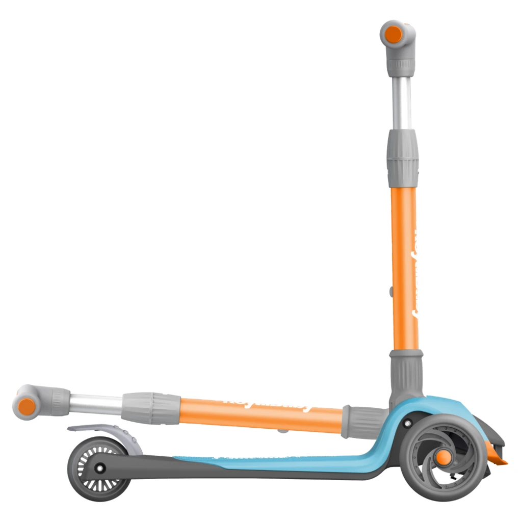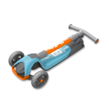 - Самокат легко складывается, автоматически фиксируется, удобно перевозится в сложенном виде с помощью запатентованной выдвижной ручки.