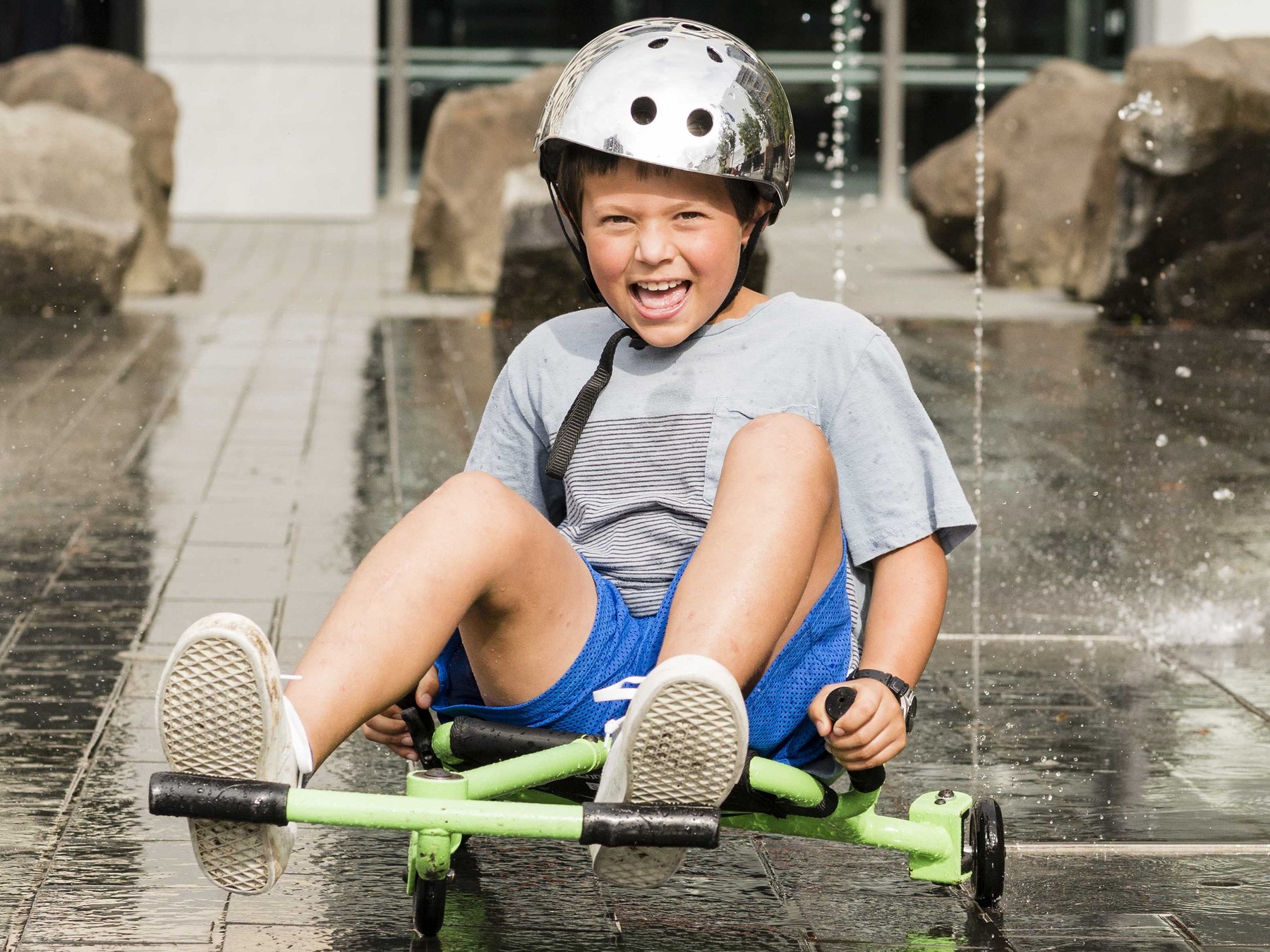 Чтобы привести его в движение, достаточно попеременно двигать ногами на перекладине. Ezyroller развивает скорость до 15 км/ч, двигаясь «по-змеиному», без цепей или педалей, без батареи с помощью простых движений ног. Ребенок — генератор мощности. Управляется этот детский самокат с помощью ручек по бокам кресла