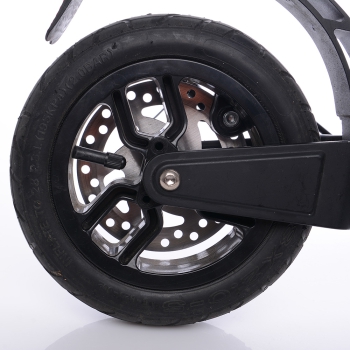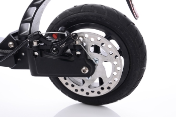 Торможение осуществляется за счет мощного механического дискового тормоза на заднем колесе, который также легко обслуживается в полевых условиях при поломке. Расстояние между тормозной ручкой и рулем регулируется под размер ладони, по этому он достаточно универсален, так как подходит под детскую и взрослую руку. Анатомические грипсы обеспечивают надежный хват, и оборудованы бортиками, которые защищают от соскальзываний.