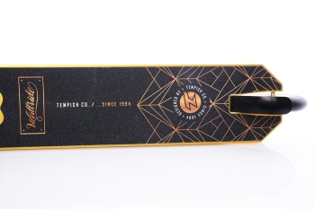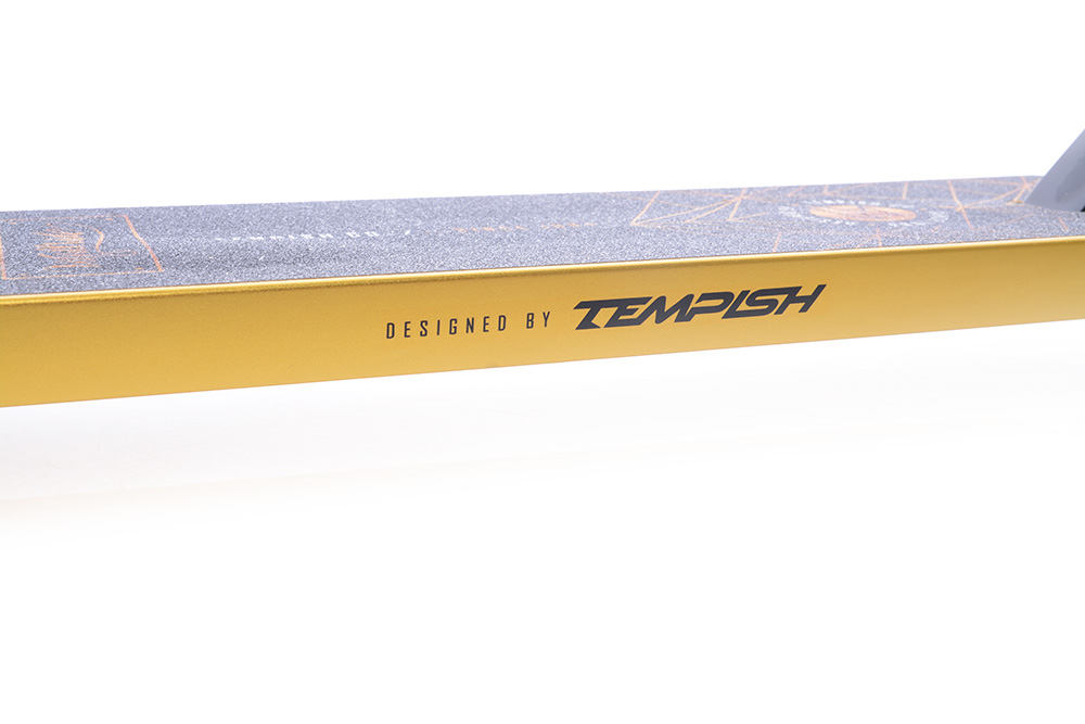 Дека и вилка выполнены из высококачественного авиационного алюминия. Хоть такой сплав сложнее поддается обработке, результат такой детали впечатляющий, именно поэтому его используют для формирования запчастей под трюковые комплиты. В результате они получают высокие показатели упругости, текучести и прочности.