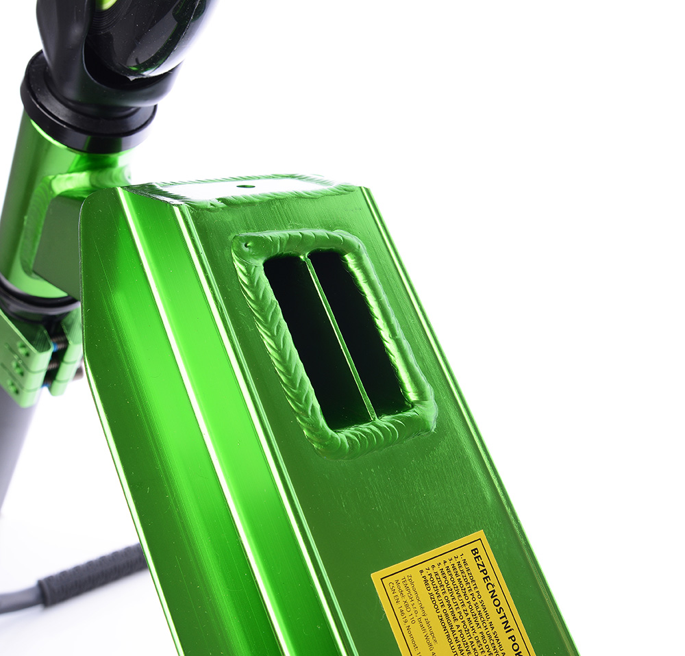 Материал самоката подвержен элоксации - это вид химико-термической обработки алюминиевых изделий. Он заключается в создании на поверхности защитного слоя оксида алюминия, который больше не окисляется и, таким образом, защищает сам алюминий от окисления.